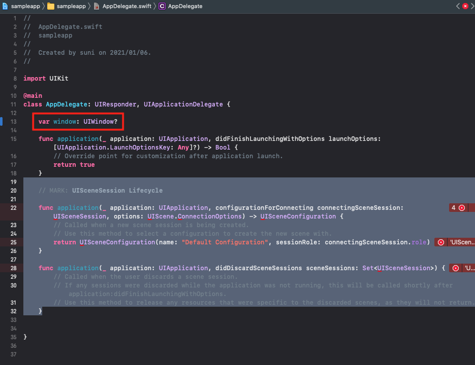AppDelegate.swift 에서 window 변수를 선언합니다.