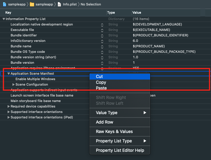 info.plist 에서 Application Scene Manifest를 삭제합니다.