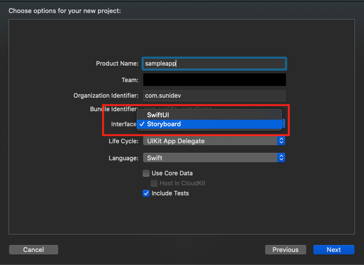 Interface를 Storyboard로 지정하여 프로젝트를 생성합니다.