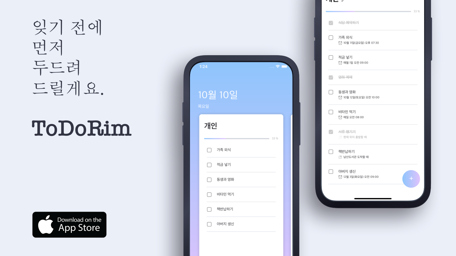 "잊기 전에 먼저 두드려 드릴게요." ToDoRim은 할일을 관리하고, 미리 알림을 설정할 수 있는 어플입니다. *** 주요 기능 *** * 쉽게 할일을 관리해보세요. - 한번 탭으로 완료 체크 - (+) 버튼으로 새