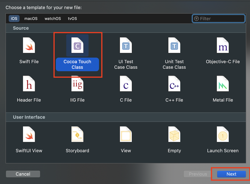 New File -> iOS > Cocoa Touch Class를 클릭합니다.