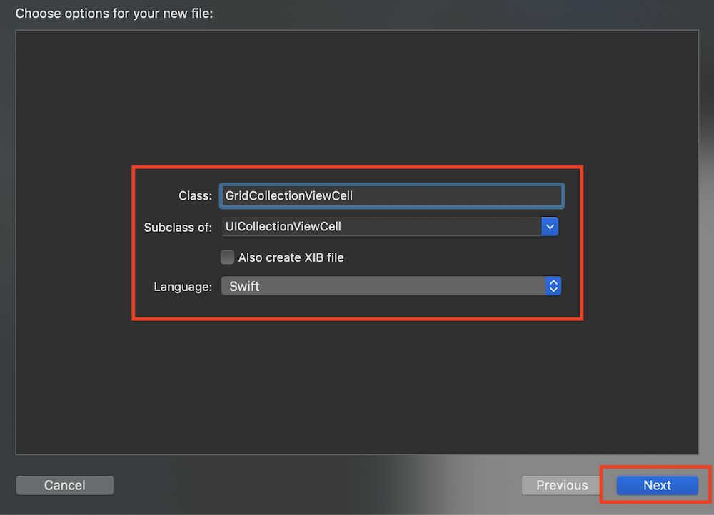 Subclass of > UICollectionViewCell로 설정하고, Class 명을 원하는 명으로 바꾼 뒤 Next를 클릭합니다.