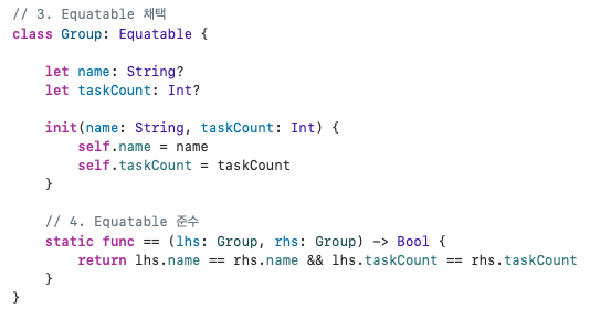 위 코드에 name과 taskCount는 Equatable이 이미 채택되어 있는 타입(Int, String, Double 등..)이어서 오류가 발생하지 않습니다.