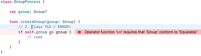 연산자 함수 '=='를 사용하려면 'Group'이 'Equatable'을 준수해야 합니다.
