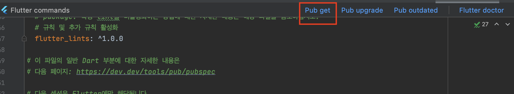 Pub get 버튼을 클릭하여 설정 적용