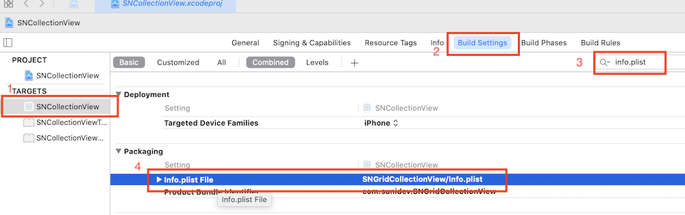 Targets > 프로젝트 선택 > Build Settings > ‘info.plist’ 검색 > info.plist File을 선택하고 엔터를 쳐줍니다.