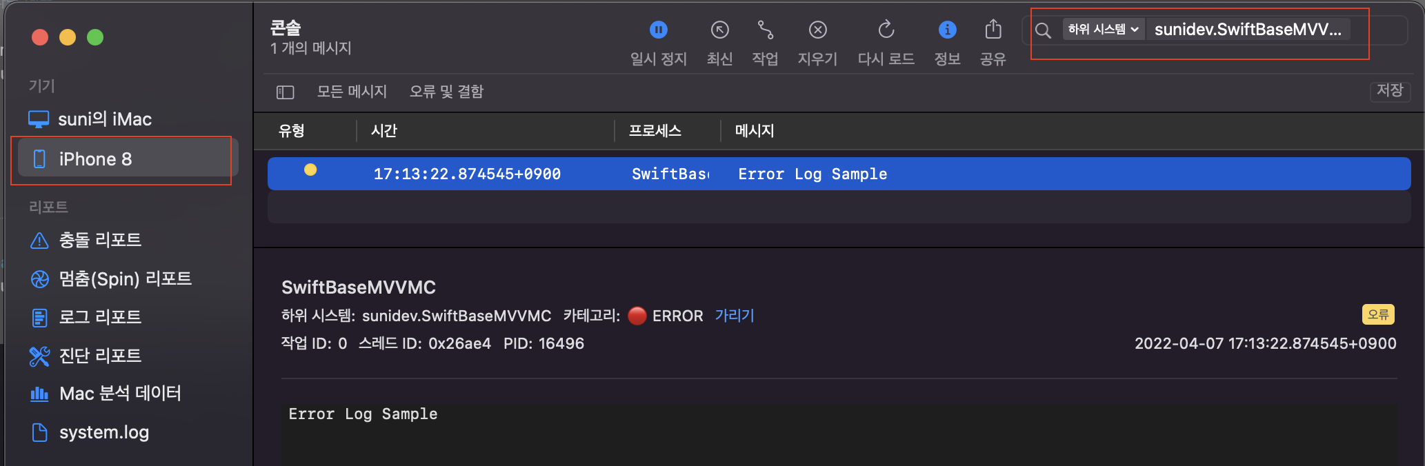 - '콘솔' 앱 > 기기 선택 > Bundle ID 검색 > 하위 시스템 선택